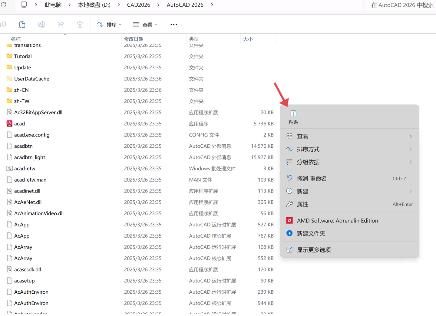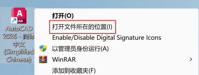 鼠标右击桌面的CAD2026图标,选择打开文件所在的位置。